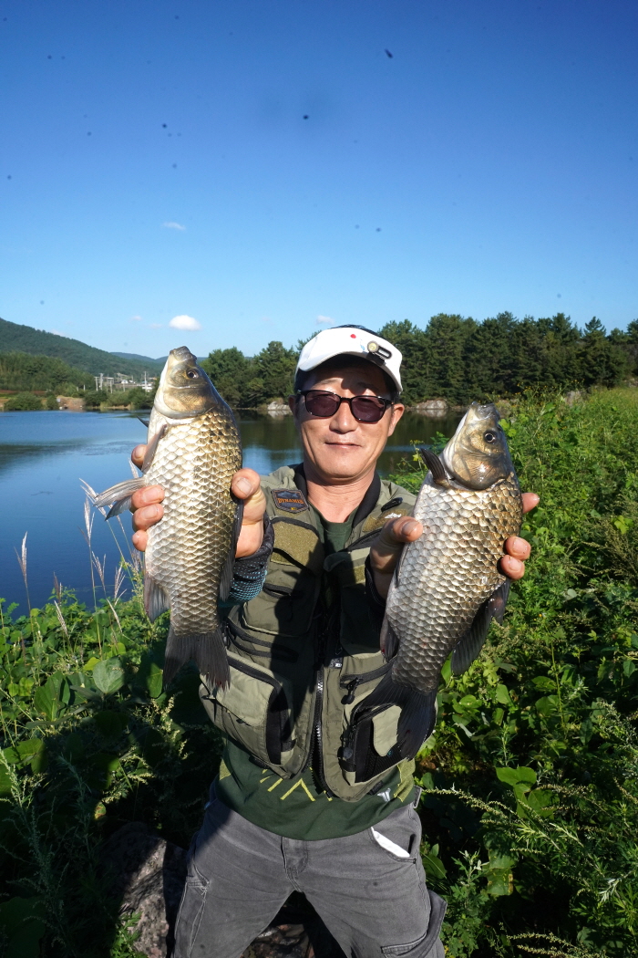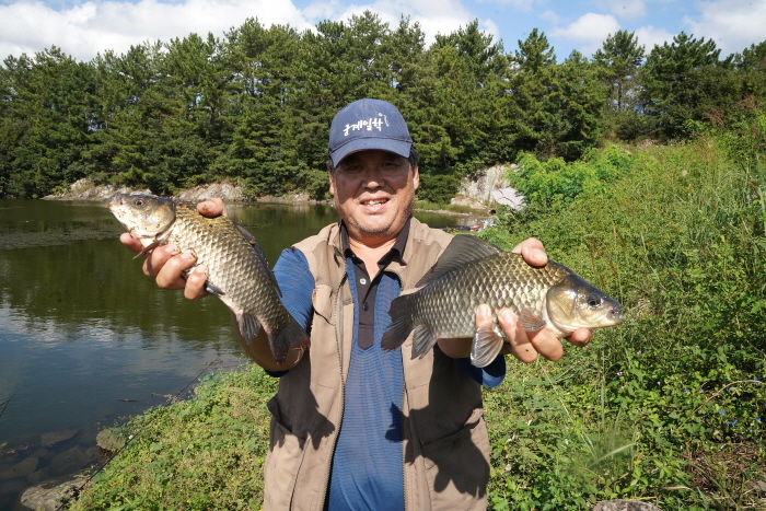 제방에서 낚은 2마리의 월척을 보여주는 권석구 씨.