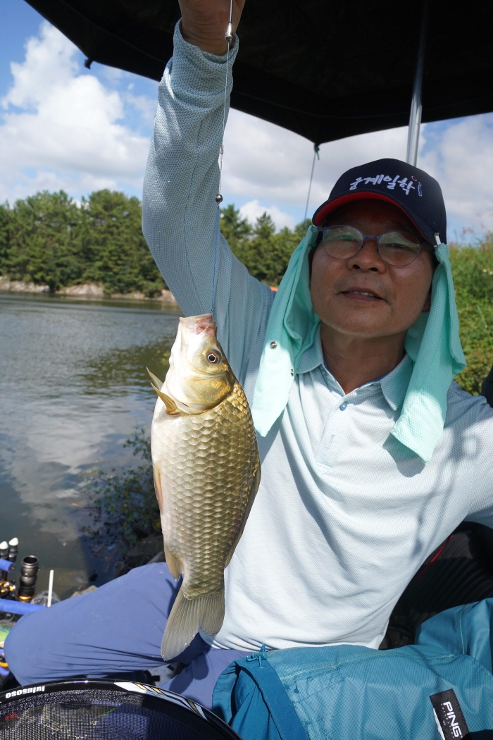 세동지 제방에 자리한 성제현 씨가 월척 붕어를 끌어내고 있다.