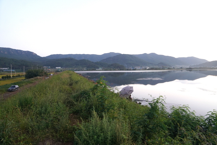 세동지 제방 포인트. 왼쪽의 제방 밑 도로에 주차할 수 있다.