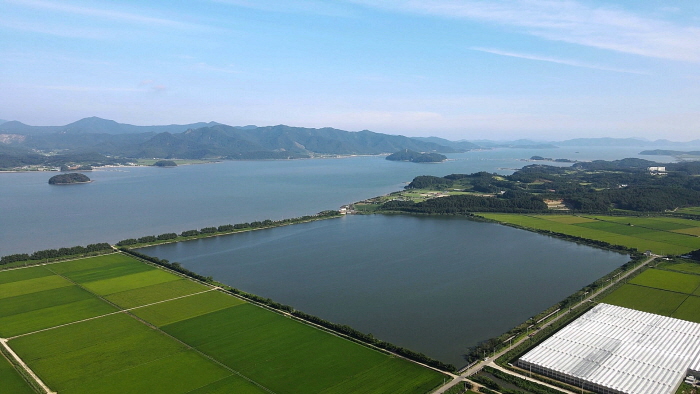 드론으로 촬영한 막덕호. 바다와 붙어있는 간척호다.