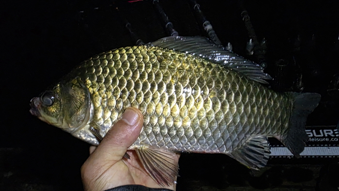 미끼는 옥수수어분글루텐을 사용하였는데 대편성 중 입질을 받아 올라온 녀석은 6치 정도의 잔챙이였다. 전에 보지 못했던 작은 사이즈라 웬일인가 싶었다. 그렇게 뜸한 입질 속에 밤이 깊어가던 밤 9시경. 멋진 찌올림 끝에 나온 붕어는 아쉽게도 8치 붕어였다.