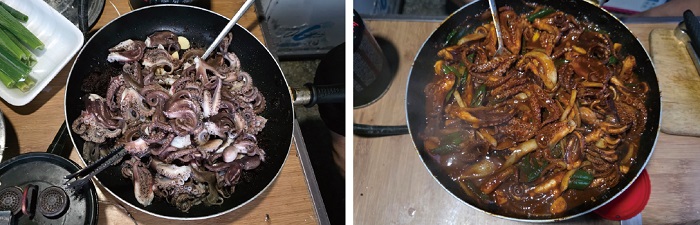 원산도에서 낚은 주꾸미로 볶음을 만들고 있다.
