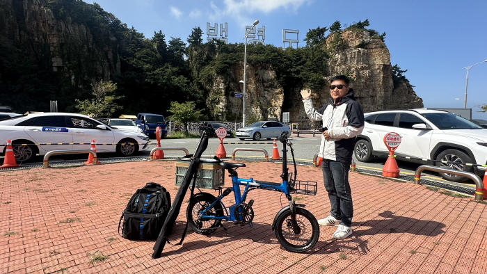 백령도 용기포신항에 도착한 후 백령도 안내판 앞에서 기념사진을 찍었다. 이번 취재에는 작은 전기자전거를 싣고 가 현지 포인트를 탐색했다.