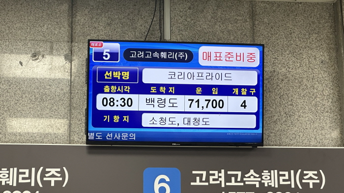 백령도행 코리아프라이드호의 출발을 알리는 전광판.