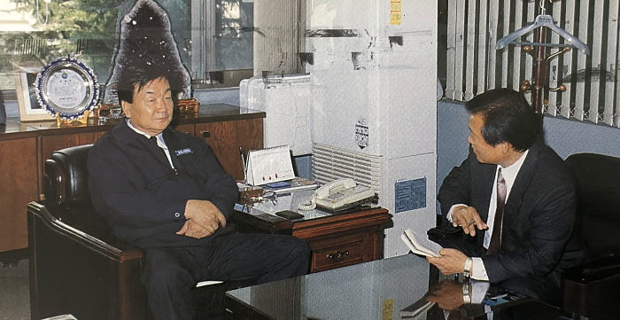 지난 2003년, 은성사 접견실에서 낚시춘추와 인터뷰를 진행 중인 박보국(왼쪽) 사장.
