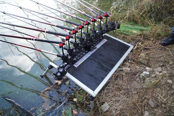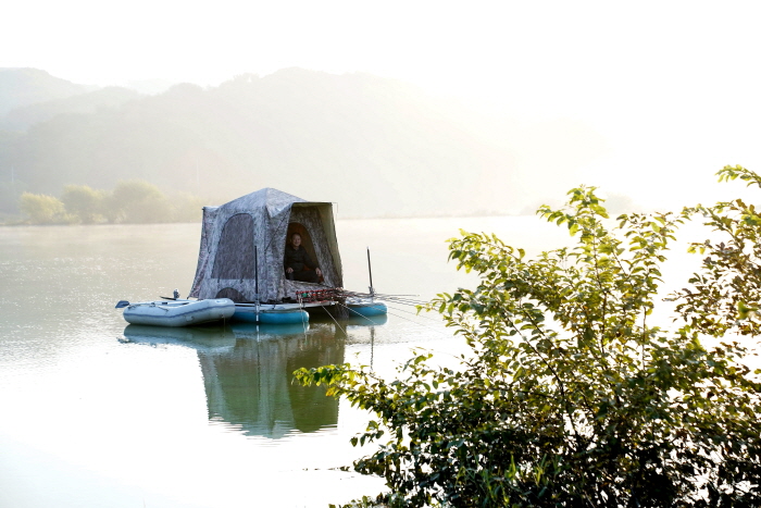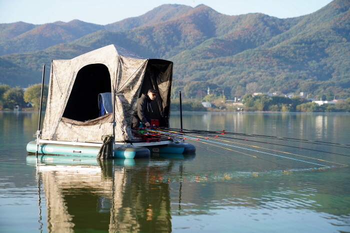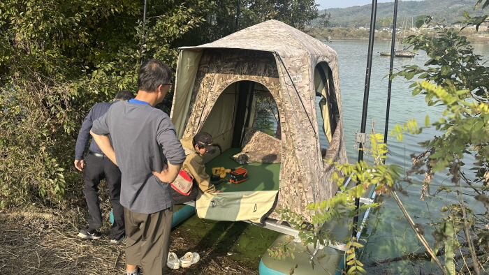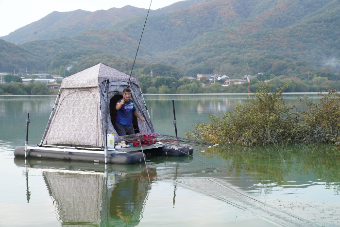 마그마레저 표기홍 상무가 대편성을 마친 후 입질을 기다리고 있다. 꿀렁임이 적은 상판 위에 에어텐트를 설치해 마치 일반 수상좌대에서 낚시하는 느낌을 주고 있다.