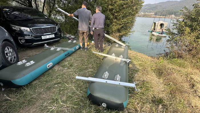 이날 마그마보트클럽 회원들이 론칭한 우안 중상류 신유리 앞도 먼저 출조한 낚시인 차량이 주차돼 있으면 보트를 물가까지 운반, 조립하는 게 쉽지 않았다. 이날은 전날 먼저 출조한 윤기호 회원이 본부석을 잡아놓은 터라 그나마 큰 무리 없이 보트를 론칭할 수 있었다.