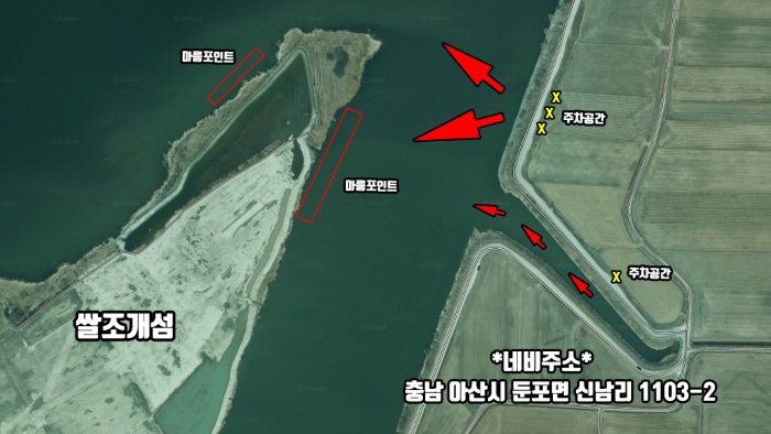 이전에도 입구를 막아 놓아 짐을 들고 물가로 가 보트를 폈으나 최근에는 그러기도 애매한 상황이다. 그래서 우리는 묘안을 냈다. 어차피 입구에서 보트를 펴면 노를 저어 포인트까지 가야돼 힘이 들다. 그럴 바에는 포인트 인근까지 간 뒤 석축 위에서 보트를 펴 포인트로 들어가는 게 낫겠다고 판단한 것이다. 그래서 우리는 기사의 맨 뒤 주소지에 나와있는 도로변까지 이동한 뒤 석축 위에서 보트를 조립했다.