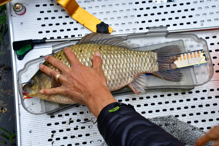 윤상배 씨가 올린 44cm 붕어를 계측하고 있다.