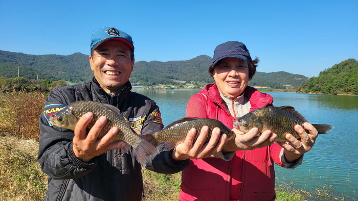 전용배, 서미숙 씨가 천망제에서 수확한 월척 조과를 자랑하고 있다.