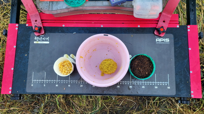 새우와 참붕어를 채집하기 전에 사용한 글루텐 떡밥.