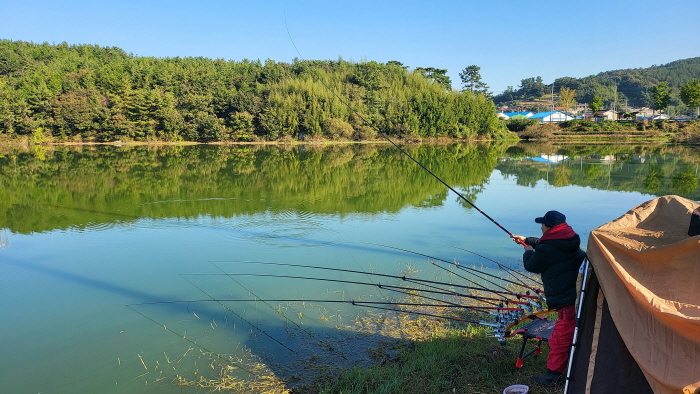 상류권을 중심으로 1~2m의 수심을 유지하고 삭아 내린 마름 줄기가 가끔 바늘에 걸려 나올 뿐 비교적 바닥상태는 깨끗한 편이었다. 근처의 일부 논은 추수가 끝났으나 아직도 많은 논은 수확이 이루어지지 않은 상황. 텅 빈 연안을 둘러보며 여건을 확인할 무렵 전용배 씨 부부가 도착했다. 녹조가 걸림돌이었으나 자세히 들여다보니 농도가 약했고 하층은 물색이 괜찮아 보였다. 더 이상의 고민 없이 거리를 두고 나란히 자리를 잡았다.