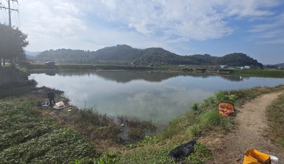 그러던 중 김현철 회원이 “주말에 가면 자리가 없을 테니 주중에 들어가자”고 제안을 했다. 필자는 좋다고 답을 한 뒤, 10월 22일 목요일 근무를 조금 앞당겨 마무리 한 후 희야지로 급히 내달렸다. 그러나 이때 역시 여러 명의 낚시인이 먼들어와 좋은 자리를 선점한 상태였다. 다행히 도로 옆 물골자리 반대편 라인은 모두 비어 있었고 함께하기로 한 김현철 씨와 로즈피싱 회원 두 명이 필자보다 먼저 도착해 낚싯대를 세팅 중이었다. 서너 자리는 여유가 있어 필자는 입구에서 두 번째 자리를 잡았다.