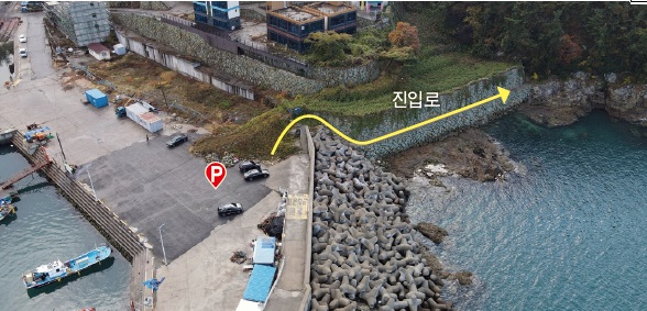 ●주차 및 진입_방파제 초입에 주차할 수 있다. 주차 후 방파제로 올라가는 계단길을 오르면 방파제로 향하는 길과 갯바위로 향하는 길로 나뉜다. 30m 정도 걸으면 갯바위에 도착해 쉽게 진입할 수 있다.