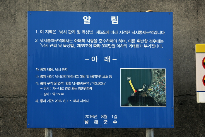 ●주차 및 진입_엘림마리나리조트 위에 있는 남해시즌관광호텔 길로 진입하면 공동묘지가 나온다. 공동묘지에 주차하고 산길을 따라 빨간등대방파제까지 진입할 수 있다. 예전에는 길이 험해 무거운 밑밥통과 장비를 가져가기 힘들었지만 지금은 길이 완전히 다져져 초행이라고 쉽게 길을 찾아 내려갈 수 있다. 방파제 입구에 텐트나 비닐하우스 등이 여러 동 설치되어 있어 쉽게 찾을 수 있다.