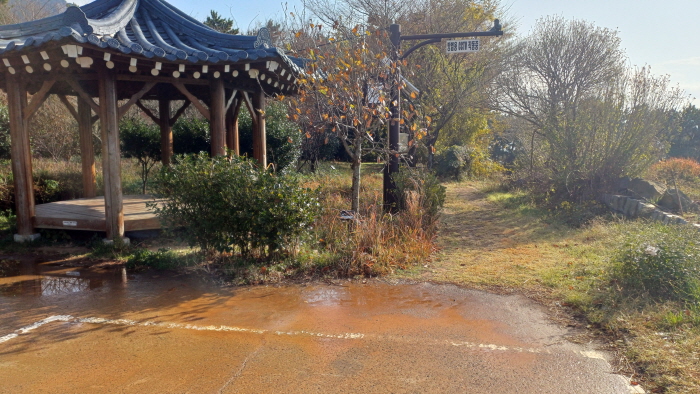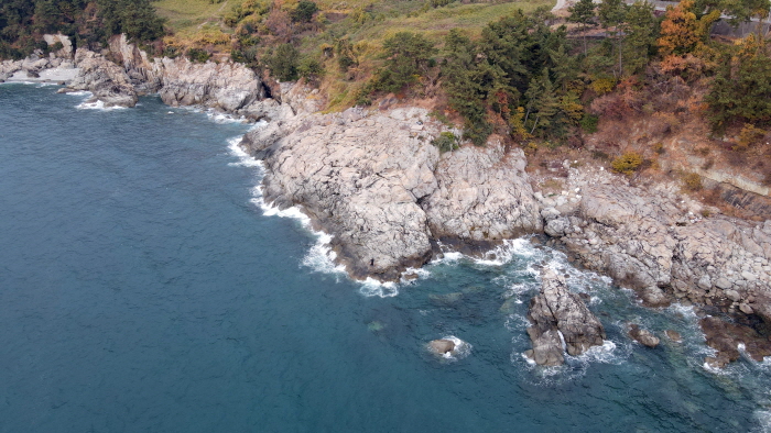 공동묘지에 있는 정자 옆으로 갯바위 진입로가 있다.