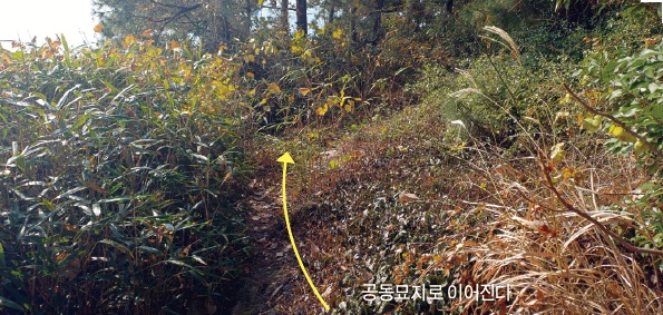 폐가와 공동묘지 사이로 나 있는 진입로. 이곳은 위험하므로 추천하지 않는다. 폐가에서 진입해 계속 걸어가면 공동묘지가 나온다.