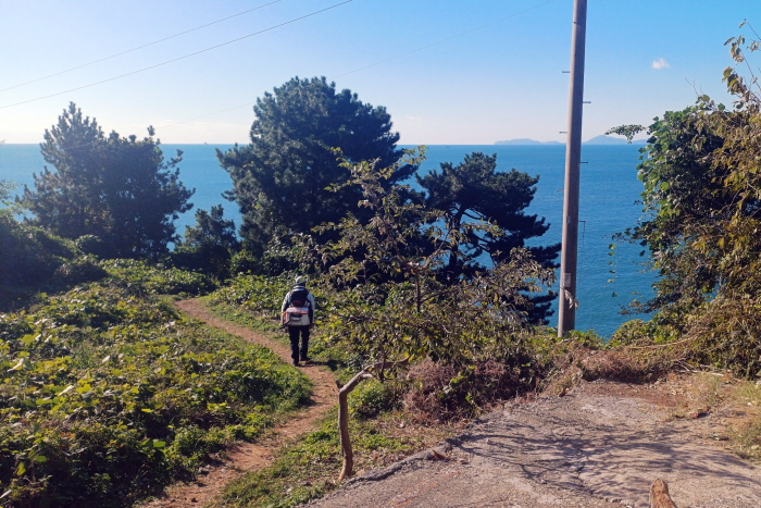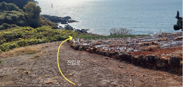 갯바위 진입로. 언덕을 올라가 우측으로 걸어가면 갯바위가 나온다. 방파제는 낚시금지.