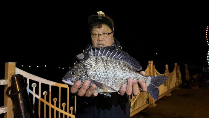 밤낚시에 낚인 45cm 감성돔을 보여주는 해남의 홍성복 씨. 밤뿐 아니라 낮에도 큰 씨알이 종종 올라온다.