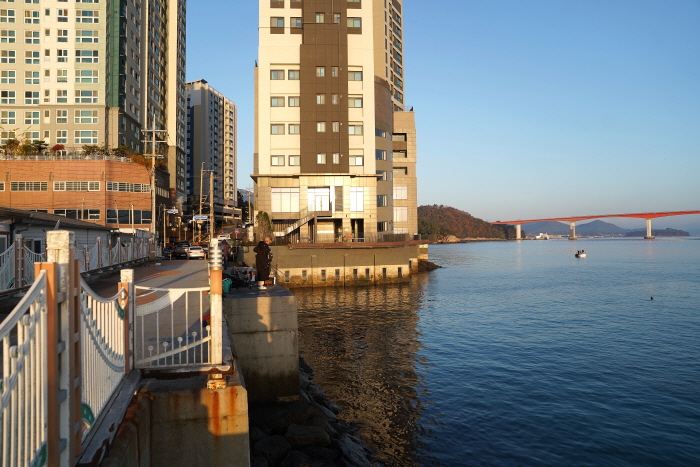 그나저나 이곳을 처음 온 사람이라면 방파제 초입에 준공한 더 플래티넘 아파트의 존재에 깜짝 놀라고 신기해한다. 완도에서는 드문 초고층 37층 아파트인데다가 분양가가 완도권 최고액인 5억원에 달하기 때문이다. 심지어 아파트 맨 하부는 갯바위가 떠받히고 있는데, 썰물이 되면 물에 잠겨있던 갯바위가 드러나 그 자체만으로 신기하다. 이쯤 되면 아파트 창문을 열고 채비를 던져도 될 정도이며 실제로 문어와 주꾸미를 노리는 낚싯배들이 아파트 30여 미터 앞까지 접근해 낚시를 하고 있다. 참으로 신기한 풍경이 아닐 수 없었다.