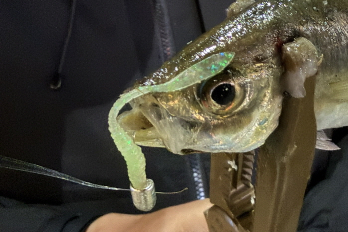 1g 지그헤드를 세팅하고 첫 캐스팅, 라인의 상태를 살핀 후 텐션을 유지했다. 웜이 천천히 가라앉는 과정을 머릿속으로 그리며 로드를 드는 순간 ‘툭’하는 입질이 왔다. 바람 소리보다 약한 그러나 분명한 신호가 손가락 끝을 건드렸다. 전갱이다.