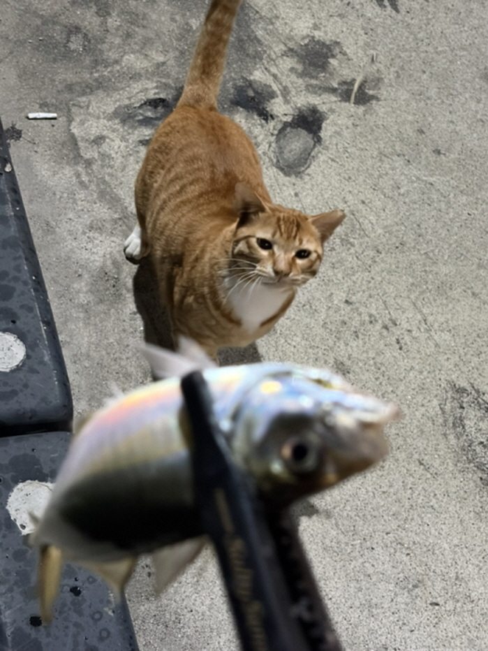 전갱이에게 관심을 보이는 고양이.