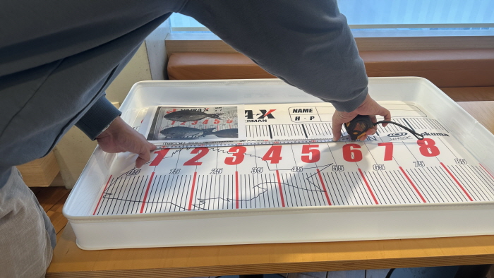 트렁크 트레이 계측자의 오류가 발견됨에 따라 긴꼬리벵에돔 기록을 새롭게 실측해야 했다. 사진 상 계측 지점의 실제 길이를 측정하는 장면.