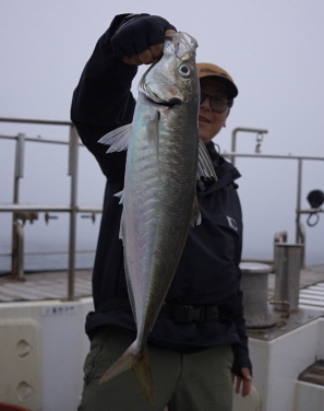 56.4cm로 역대 기록을 경신한 이돈관 씨의 전갱이. 통영 국도 해상에서 낚았다.