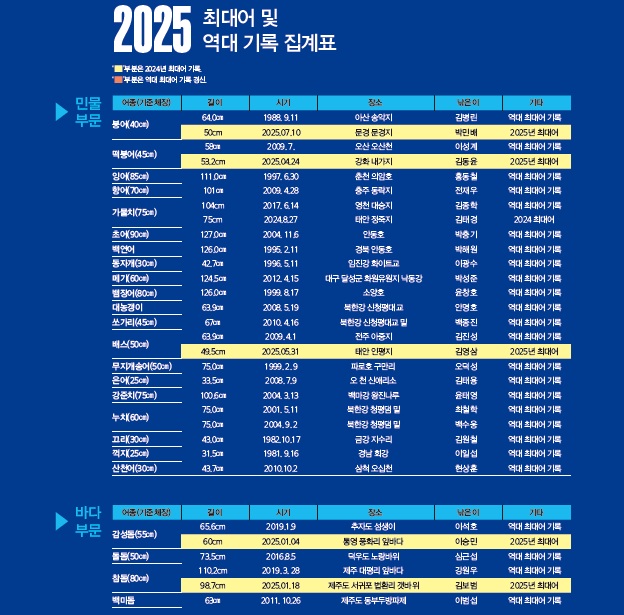 부진했던 2025년 조황에도 불구 바다 부문에서 4개 어종이 신기록을 경신한 것은 고무적이었다. 넙치(광어), 삼치, 전갱이, 참다랑어가 주인공으로, 모두 루어낚시로 올린 것들이다. 그만큼 바다 루어낚시의 인기가 시간이 갈수록 뜨거워지고 있다는 사실을 알 수 있었다.