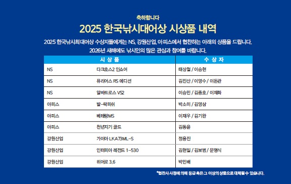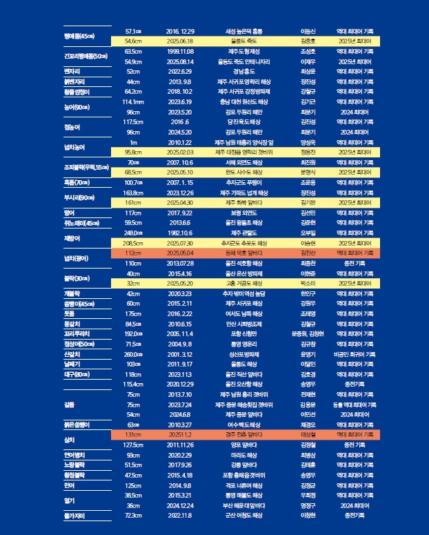 그 밖의 연간최대어는 다음과 같다. 감성돔은 이승민 씨가 낚은 60cm(61cm로 접수), 넙치농어는 정용진 씨가 낚은 95.8cm(98cm로 접수), 방어는 김현일 씨가 낚은 106cm(110cm), 볼락은 박소미 씨가 낚은 32cm(33cm로 접수), 부시리는 김기완 씨가 제주 화북 앞바다에서 낚은 161cm(164cm로 접수), 삼치는 태상철 씨가 경주 전촌 앞바다에서 낚은 131cm(133cm로 접수), 조피볼락(우럭)은 문명식 씨가 완도 사수도 해상에서 낚은 68.5cm(69cm로 접수), 참돔은 김보범 씨가 제주 서귀포 번환리 갯바위에서 올린 98.7cm(100cm로 접수)가 2025년 연간 최대어에 선정됐다.