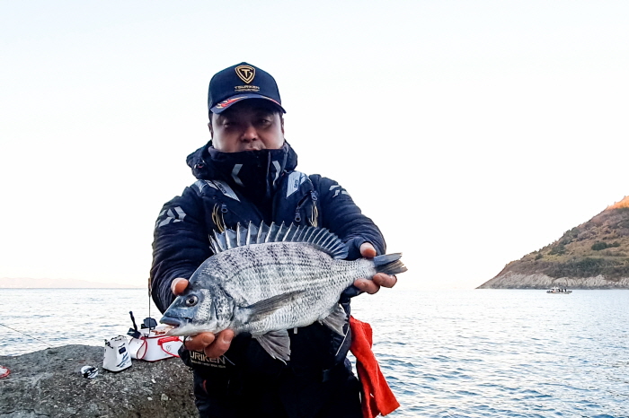 이동수 회장은 물속 지형이 복잡해 잦은 견제를 반복하며 감성돔 입질을 받아냈다. 특히 마을 입구 쪽으로 장타한 후 찌가 오른쪽에서 왼쪽으로 흐를 때 감성돔의 시원스런 입질을 받을 수 있었다. 초반부터 강한 힘을 쓰는 것을 보니 중치급은 되어 보였다. 올라온 녀석은 40cm 중반으로 보이는 감성돔이었다.