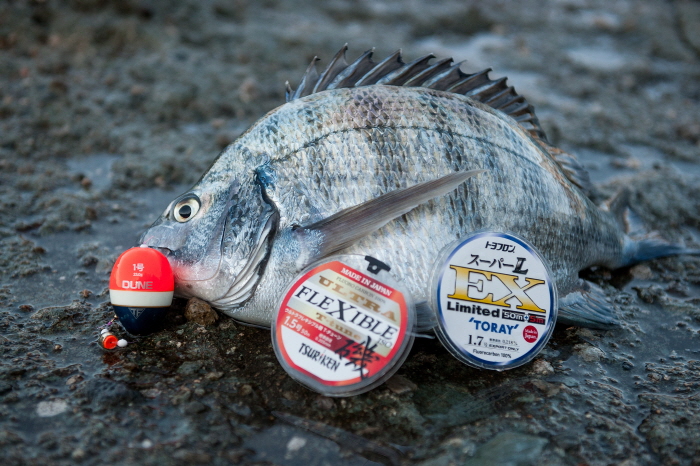 낚시 당일 사용한 채비로 낚은 감성돔. 쯔리겐의 신형 듄스 구멍찌, 토레이사의 하이퍼EX 1.7호 목줄, 쯔리겐사의 플렉시블 1.5호를 사용했다.