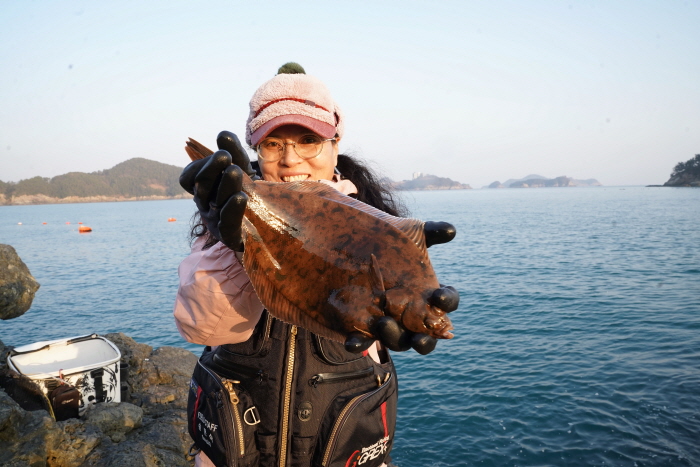장정규 씨의 부인 송문숙 씨가 돌섬 원투낚시에 올라온 가자미를 보여주고 있다.