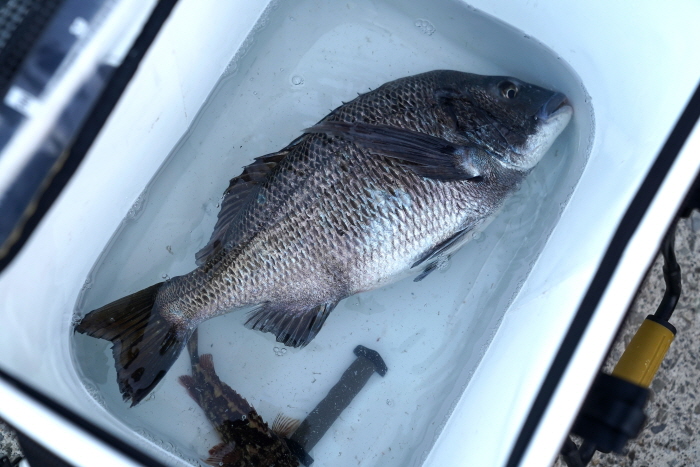 겨울철 남해도 상주권 갯바위에서 낚이는 감성돔. 밑밥통에 꽉 찰 정도의 굵은 씨알이 잘 낚인다.