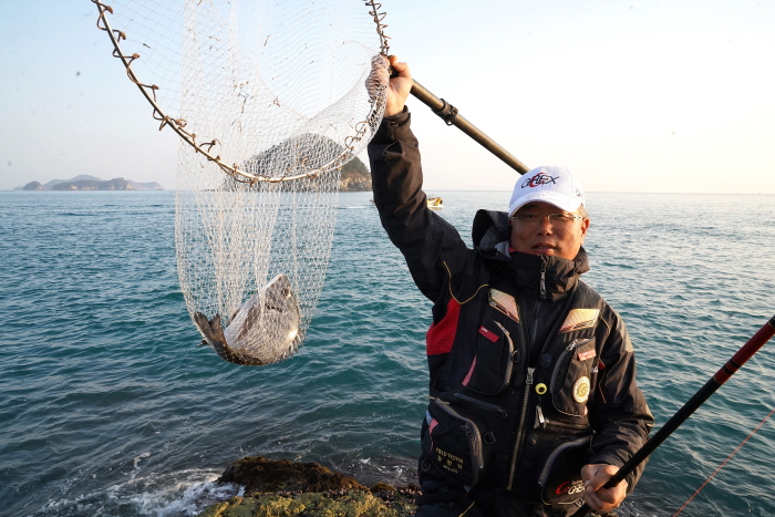 상주 내만 돌섬(승치도)에 내렸던 낚시인이 막대찌로 히트한 감성돔을 뜰채에 담고 있다.