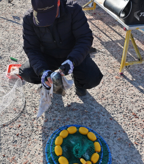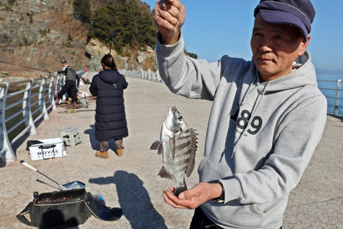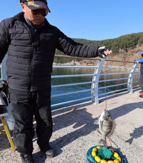 철수 후 낚은 감성돔을 보여주는 김영규 씨.