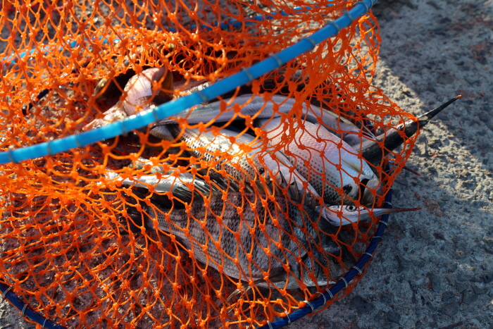 감성돔의 입질은 금방 들어왔다. 홍성집 씨가 30cm급 감성돔을 한 마리 낚았고 연이어 김영규 씨가 30cm급 감성돔을 두 마리 더 낚았다. 그런 도중 진주에서 온 낚시인이 3마리를 연거푸 낚아냈는데 가장 큰 씨알은 45cm에 육박했다. 특정 자리에서만 입질이 들어오나 했지만 방파제를 둘러보니 이곳저곳에서 30cm 감성돔이 한두 마리씩 낚이는 것을 확인할 수 있었다.