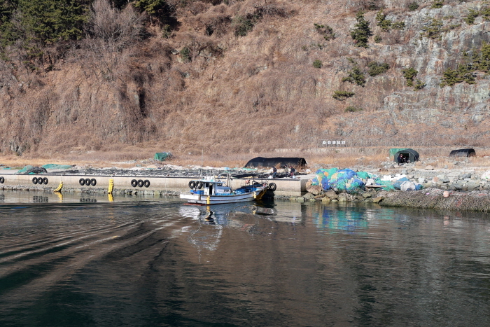 물건항과 방파제를 오가는 낚싯배.