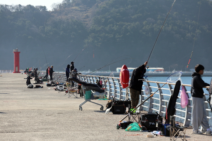 빨간등대방파제 내항에서 감성돔을 노리는 낚시인들.