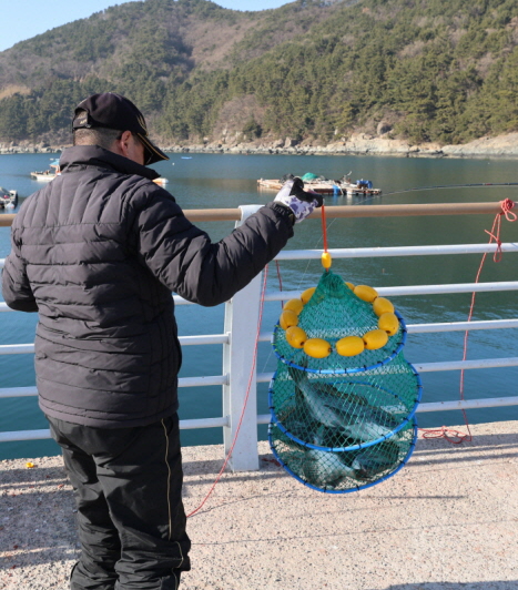 묵직한 살림망을 보여주는 낚시인.