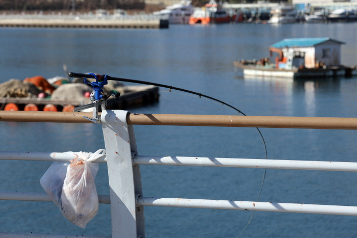 방파제 펜스에 받침대를 설치했다. 비닐봉투에는 쓰레기를 담는다.