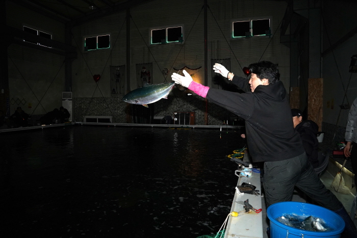 화성락바다실내낚시터 정우택 대표가 6kg급 중방어를 방류하고 있다.