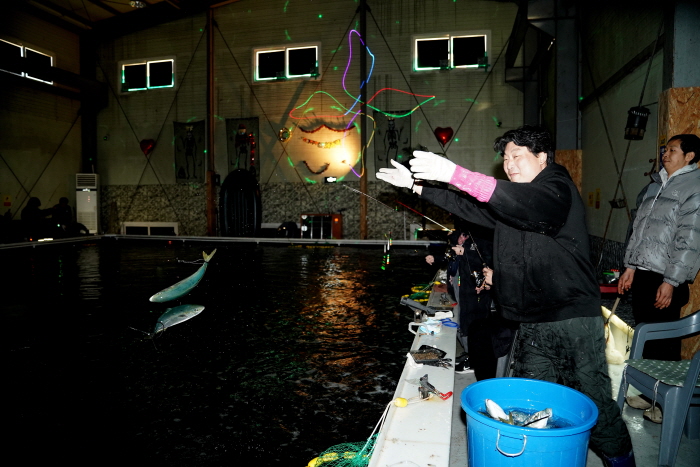 화성락바다실내낚시터를 찾은 여성 낚시인이 소방어를 걸어 파이팅을 벌이고 있다.