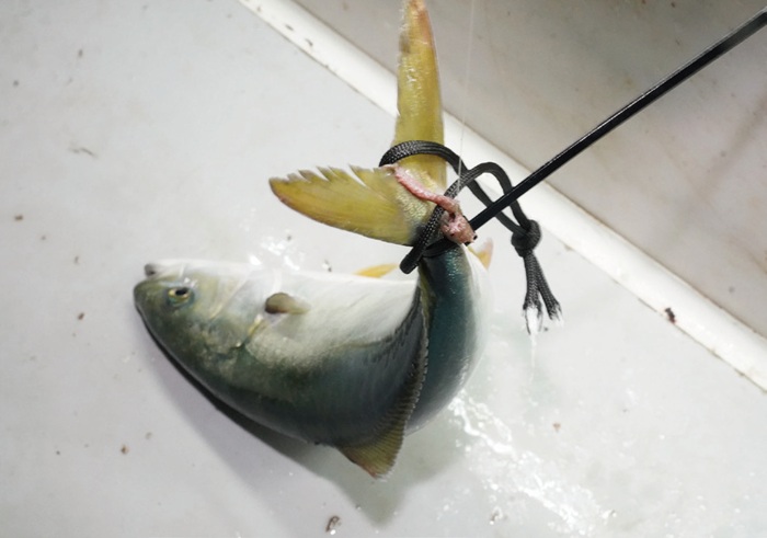 꼬리에 묶은 케이블타이에 바늘이 걸려 나온 방어.