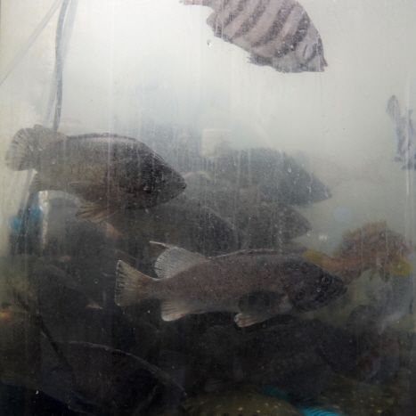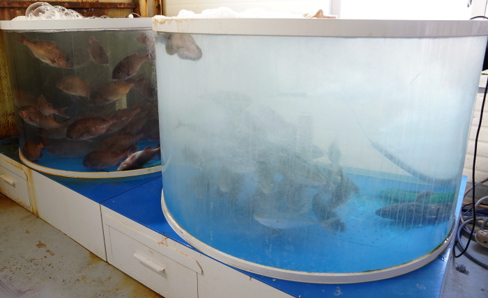 낚시터 수조에 보관 중인 참돔과 방어들.