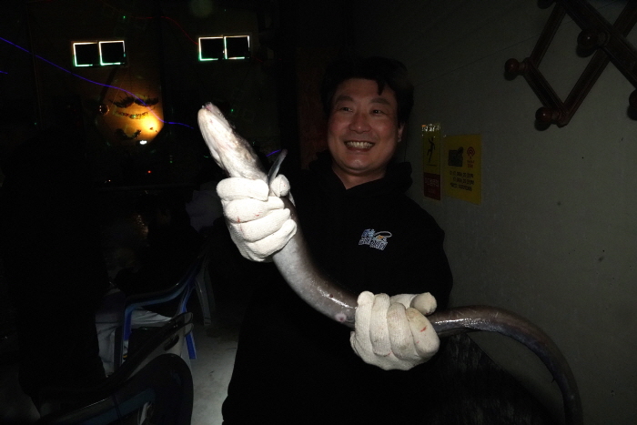 정우택 대표가 씨알 굵은 붕장어를 보여주고 있다.
