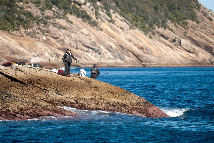 대마도 동쪽 갯바위에서 대물왕전을 치르고 있는 쯔리겐FG 회원들.