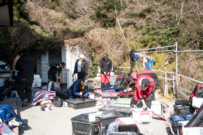 여객선이 도착한 히타가츠항에서 1시간 정도 걸려 포세이돈민숙에 도착했다. 민숙에서 준비한 간단한 점심식사를 먹고 각자의 낚시 방법에 맞는 밑밥을 준비했다. 밑밥은 민숙에서 판매하고 있다. 벵에돔낚시는 밑밥으로 시작해서 밑밥으로 끝난다고 해도 과언이 아니므로 정성스럽게 블랜딩을 하고 점도를 맞췄다.