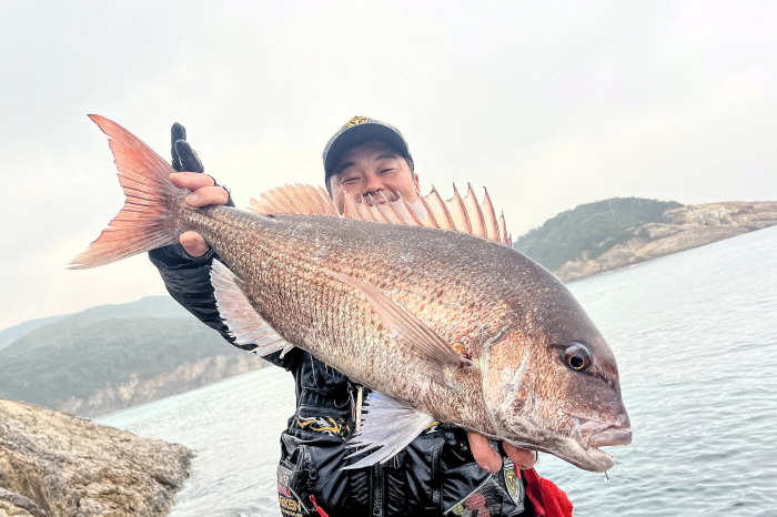 그 와중에 본류에 태워 보낸 채비에 강한 입질이 와 장시간 파이팅을 벌였는데 한참 동안의 승부 끝에 올려보니 80cm가 훨씬 넘는 참돔이었다. 80cm 참돔을 올린 채비는 쯔리겐 GT스트리머 투제로(00)찌, 원줄은 토레이 SS 슈퍼 스트롱네오 1.5호, 목줄은 역시 토레이 EX 리미티드 2호였다.