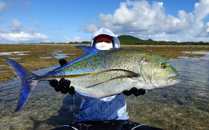80cm급 대형 블루핀 트레발리가 발 앞에서 루어를 덮쳤다. 이번 여행 최고의 손맛을 선사한 물고기다.